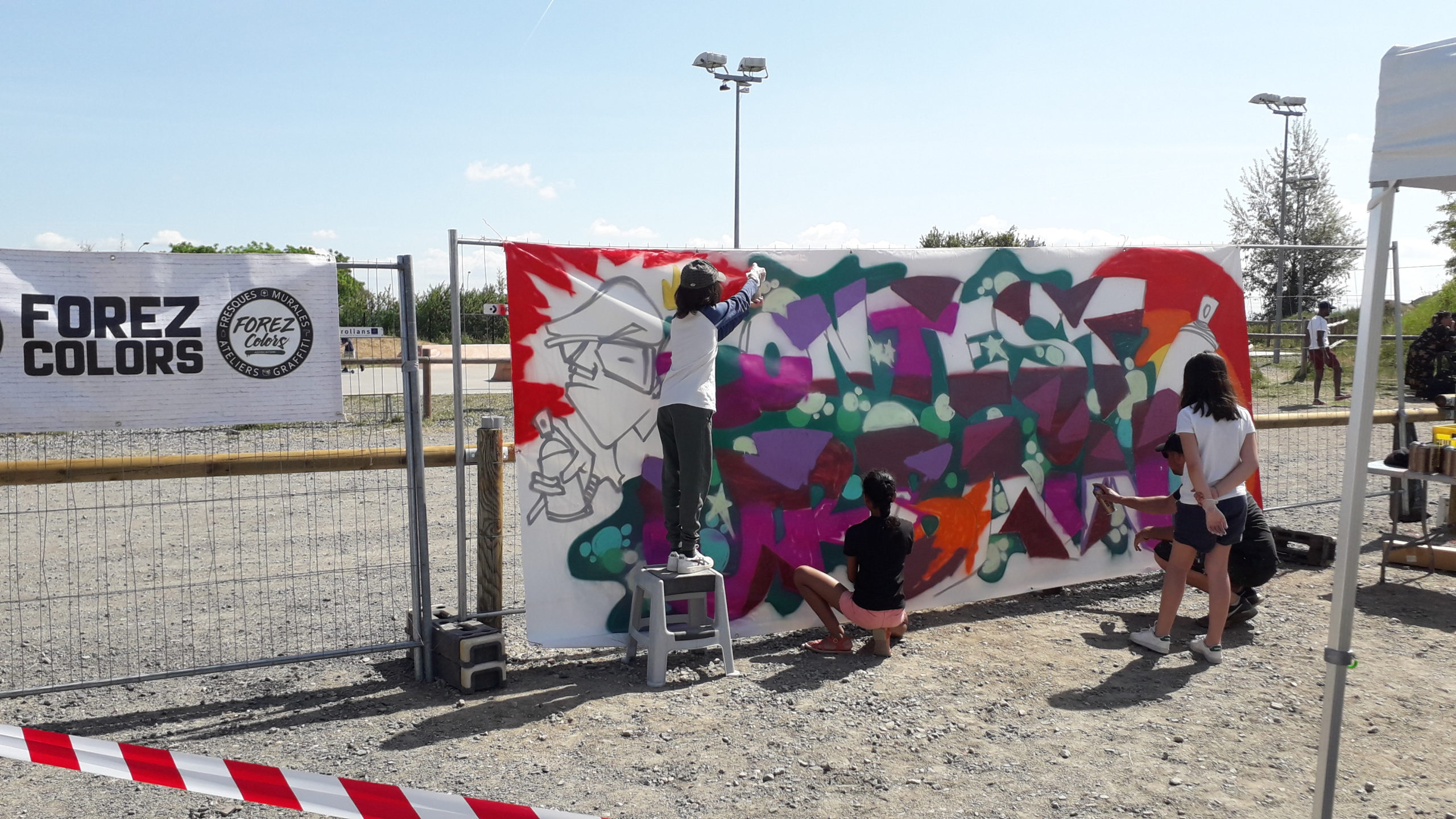 Samedi 14 Mai, la MJC de Montbrison organisait une journée initiations. De la danse Hip Hop, du freestyle foot, du skate… et du graffiti. Les participants, jeunes et moins jeunes, ont réalisé une fresque collective sur toile encadrés par UnickStreet & Ordo Ab Chaos